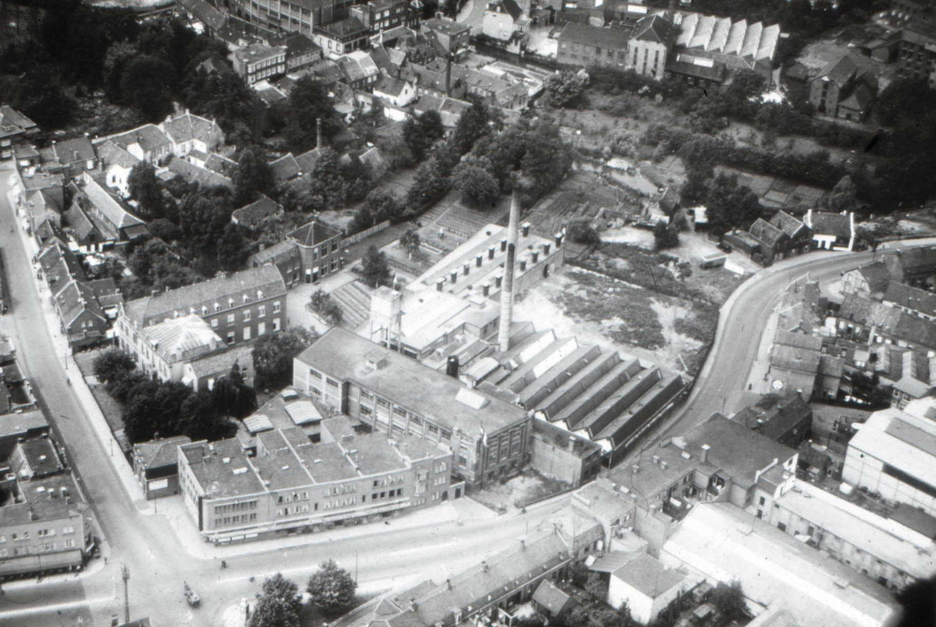 Op de voorgrond staat de Vestdijk met links de kruising Geldropseweg. Rechtsboven is een stukje van de Dommel zichtbaar. Het grote fabriekscomplex is het nog steeds bestaande bedrijf van Leo Schellens[meer]