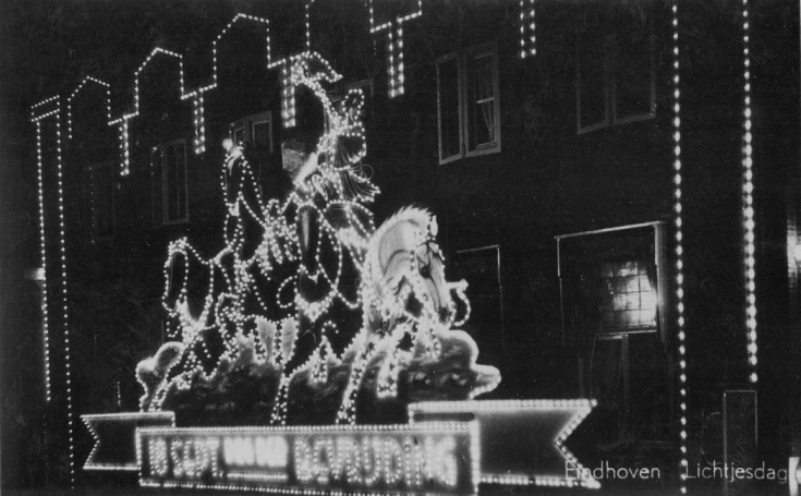Toen noemde men het Lichtjesdag, herdenking bevrijding. Jaar? In ieder geval 1951 of eerder (stempel ansicht). We zien een lichtornament van een zegekar met twee paarden. Locatie? De ansicht is een ui[meer]