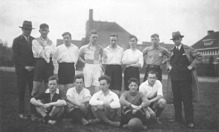Achter op de foto staan de namen: v.l.n.r. staande; Heezemans, Smulders, L. Baghuis, Wegman, Palte?, Verhulst, Wagtenberg en F. Baghuis. zittend; N.N., v.d. Wijden, Danzl?, Smit, NN. Er werd gespee[meer]