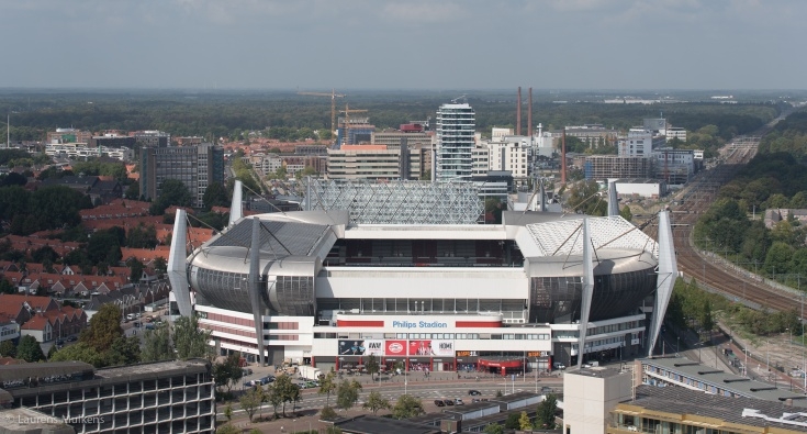 Hoogtefoto van het Philips Stadion vanaf de Langdonkenstraat.
