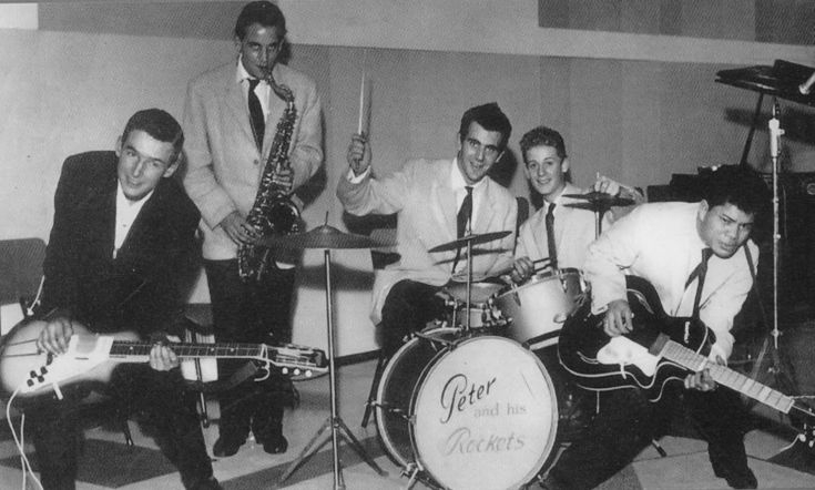 Peter en z'n Rockets tijdens een schoolfeest. Het jaartal staat niet vast. Mijn man Arend was erbij, maar weet niet meer waar deze foto gemaakt is.