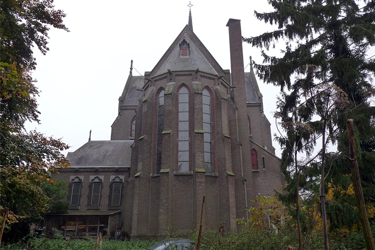 een blik op de achterkant van de kerk. De 'lang geparkeerde' auto in het struweel is vast niet van de pastoor!