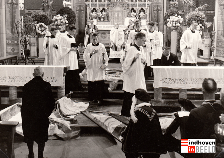 Na afloop van de eucharistieviering werd de monstrans met het Allerheiligste door de deken lopende over de uitgespreide gildevaandels naar de sacramentskapel gebracht. Voor een foto daarvan klik hier. Hierop ziet men uiterst rechts nog de ceremoniarus kapelaan W. Raijmakers. Heel mooi toch om nog eens bekende beelden te zien uit de tijd van het "Rijke Roomsche Leven".