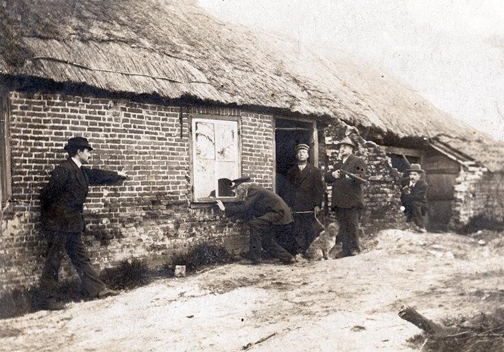 Bewoners van het Eindje circa 1920. 3e van rechts herken ik mijn oma Johanna Princen, links daarvan tante Jo en tante Mien Princen. In de deuropening staat vermoedelijk mijn opa Johannes Princen.