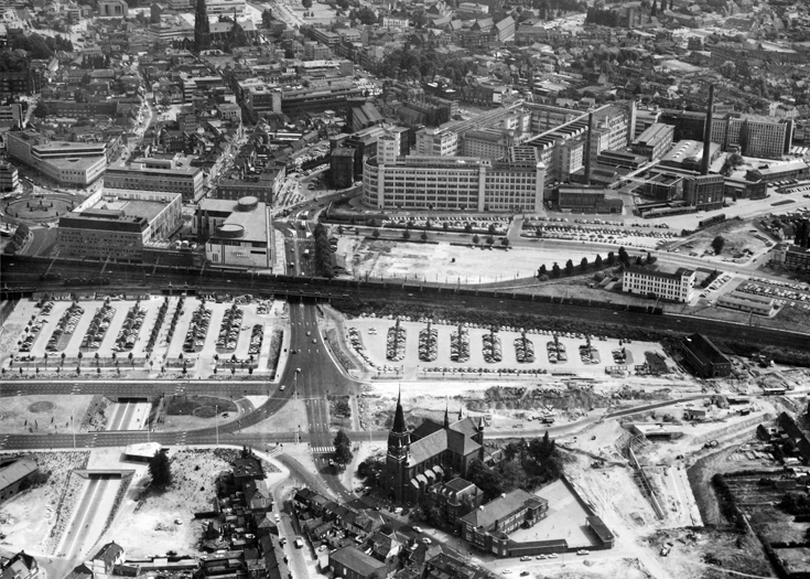 We zien hier de kruising van Beukenlaan (viaduct én ventweg) met links de Zwaanstraat en rechts de Schootsestraat. In de achtergrond links het Klokgebouw. Zie ook foto #25191 waar we de situati [meer]