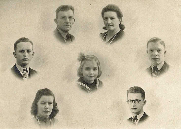Wonende aan de Gestelschestraat 25 B Johannes en Tonia met de kinderen Jan (1923), Kitty (1937), Karel (1925), Jeanne (1926) en Antoon (1922)