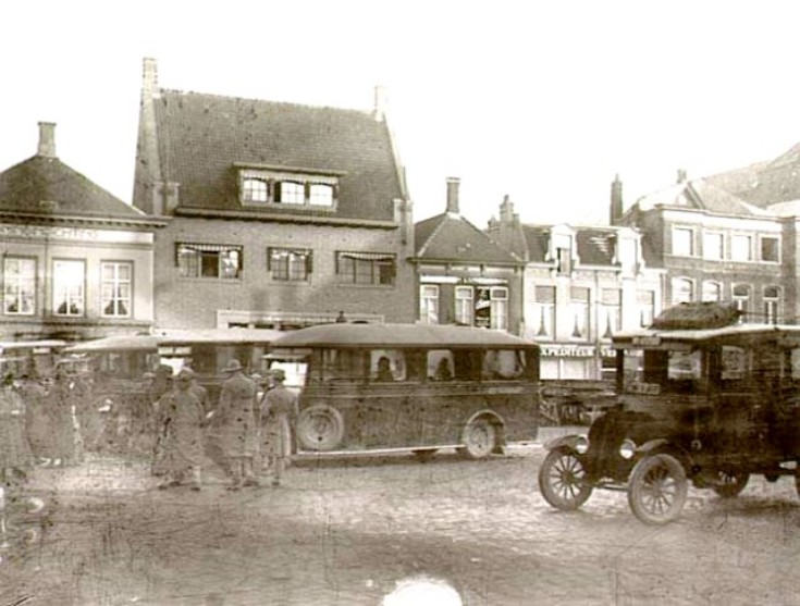 Een foto uit december 1927 met de oude bussen op de Markt. Met ingang van 1 januari 1928 zal de nieuwe stadsautobusverkeersdienst met Brockwaybussen beginnen. Aan de overzijde zien we o.a. een lunchro [meer]