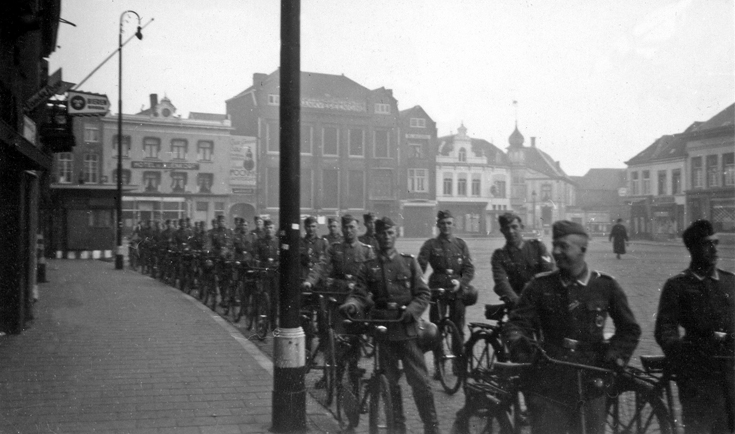 De dag van de bevrijding 18 september 1944. De hoek van de Grote Berg en de Wal. Het hoekpand is dichtgeplankt.