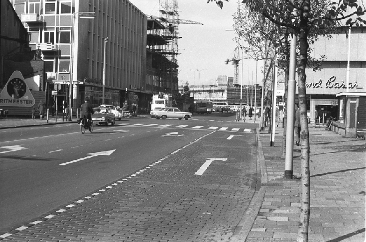 Links het Caltexbenzinestation dat midden op de kruising was gelegen. Daarachter prijkt de St Petruskerk. Op de hoek met de Kronehoefstraat staat het witte pand van woninginrichting Buis. Op de andere [meer]