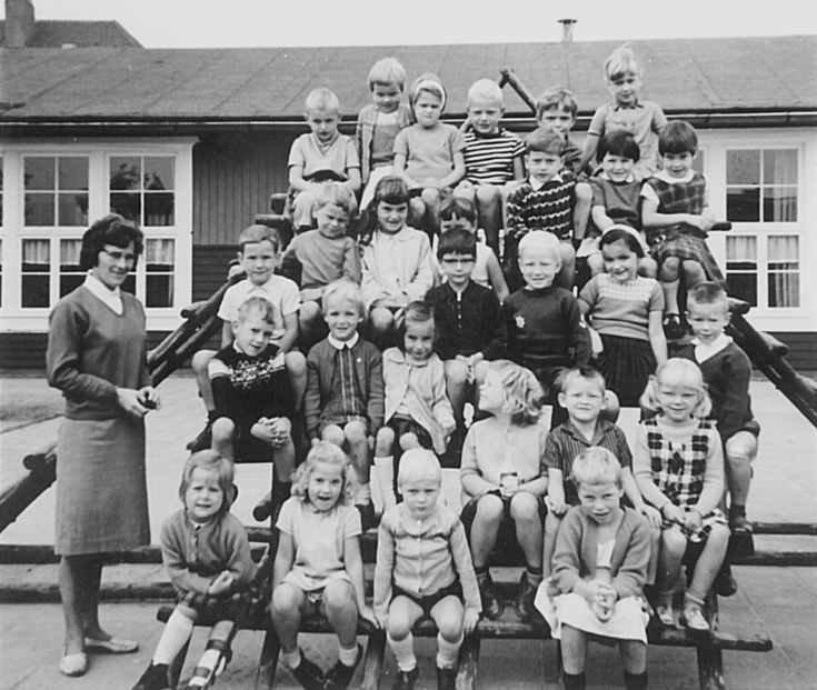 Met z'n allen op het klimrek voor de foto: v.l.n.r.: Martien van de Ligt, Andry Koetje, Marion van de Kamp, ??? 3e rij 3e meisje Karin Krielen ?? Onderste rij 1e meisje Mia Plasman