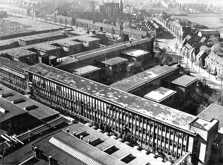 Beeld vanaf dak SAN richting Z-West. Uitbreiding SAQ is klaar. De lange dwarsvleugel (Oost-West) sluit het Nat.Lab. aan N-zijde af. Voorgrond: de productiehallen SR (1927) links en SQ (1928), liggen [meer]