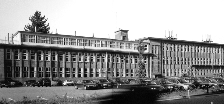 Hoofdingang met trap en bewakingsloge bestaat nu (2010) nog. Links de lange laboratoriumgang met 4x aanbouw. Dit deel had toen nog geen etage. Plaquette (rechts) is nog niet geplaatst.