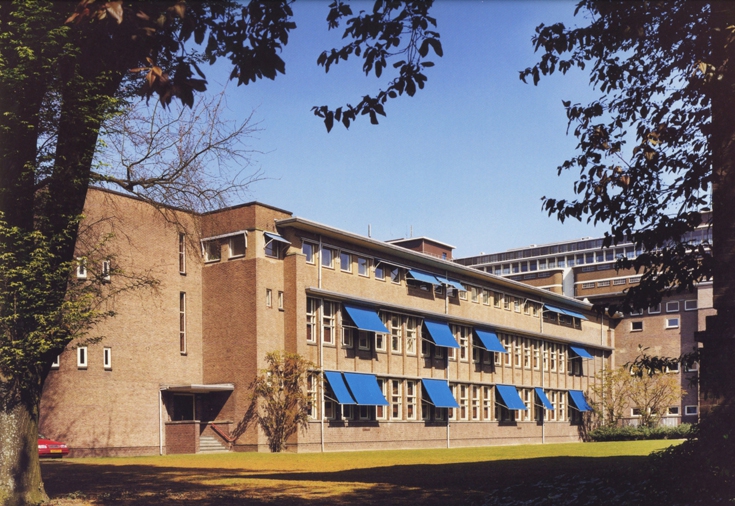 Beeld vanaf Veemgebouw, richting Zuid. Links: SDO met bibliotheek. SMM is met 1 etage verhoogd (chemie). Voorgrond de lange dwarsvleugel, waar alle andere vleugels op aansluiten. Achtergrond: gereform [meer]