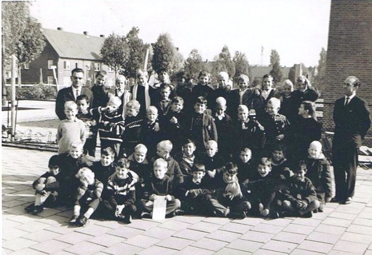 Links op de foto staat dhr Verbiest, het toenmalige hoofd van school. Rechts staat de heer L. Keij, leraar. Ikzelf (Erik Braun) sta voor de heer Verbiest met de lichtkleurige trui. Rechts op de achter [meer]
