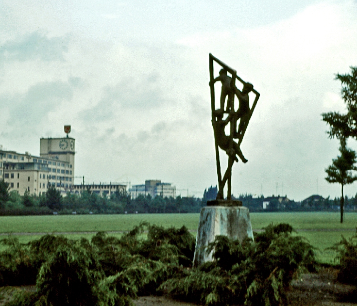 Het beeld van Willy van der Putt in het plantsoen van de Antony van Leeuwenhoeklaan. Op de achtergrond Philips' Klokgebouw.