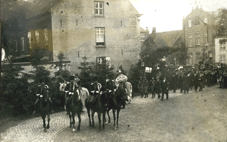 De historische optocht draait hier op de Stratumsedijk bij het pand van Floris de Moel rechtsaf om voor langs het raadhuis te defileren.