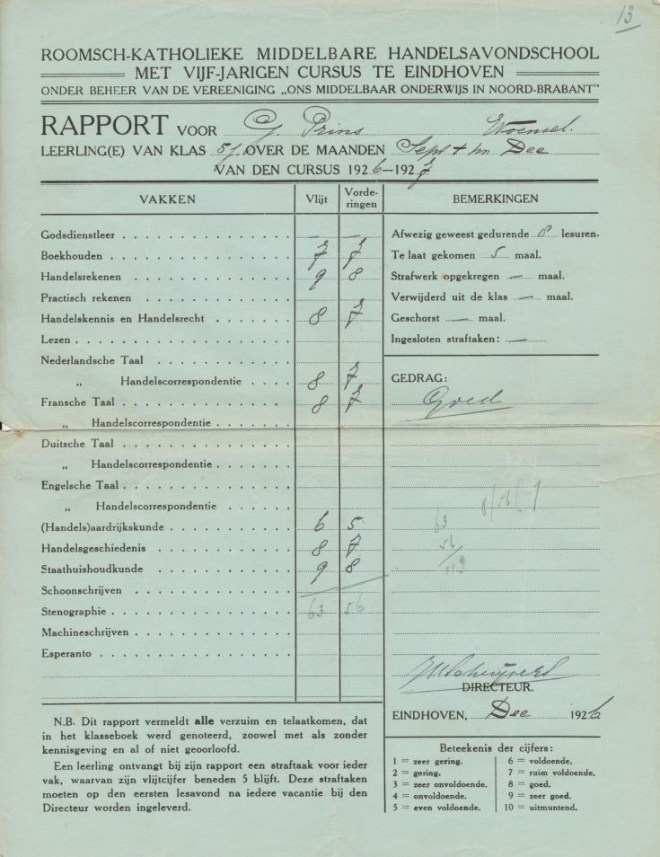 Een tussenrapport uit december 1926 van de Roomsch-Katholieke Middelbare Handelsavondschool voor G. Prins. Deze school was gevestigd op de Elzentlaan in villawijk Den Elzent. Leerling Prins [meer]