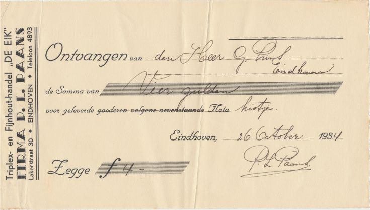 Een betalingsbewijs van de firma P.L. Paans uit 1934. Paans leverde triplex- en fijnhoutproducten, waaronder het vermelde kistje van vier gulden. Het lijkt waarschijnlijk dat het huidge pand op het ad [meer]