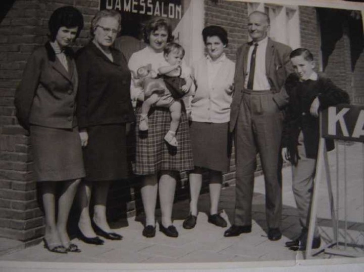 Kapper Swinkels na de verhuizing van de Hoogstraat naar de Laagstraat, tegenwoordig Christinastraat. 'n Foto voor de Damessalon, met links Sjanneke nog erbij die ook in de zaak meewerkte en op jon [meer]