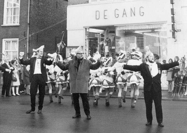 Textielwinkel De Gang van de familie Sengers. De heer Marinus Sengers was toen prins bij De Lichtstadnarren en werd op zijn verjaardag vereerd met een aubade. In de grijze jas op de voorgrond: Chris B [meer]