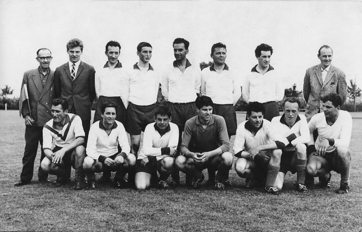 Foto is genomen voorafgaande aan een wedstrijd tegen een elftal van de Gazet van Antwerpen. Op de foto staande derde van links is ? van Doorne en ikzelf sta tweede van rechts.
