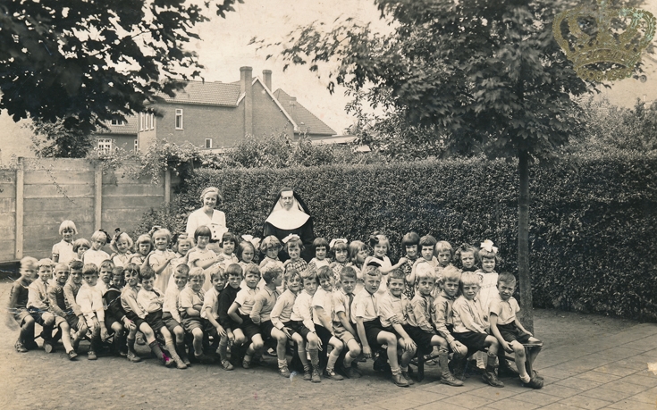 In 1938 werd het 40-jarig bestaan van deze school aan de Treurenburgstraat gevierd, vandaar het gouden kroontje in de rechterbovenhoek. Op de achtergrond Mère Catrien en juffrouw ? De meisjes [meer]