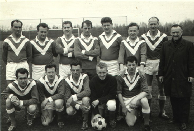 Ik dacht dat de foto is gemaakt voor de St.Nicolaasvereniging, maar ben er niet zeker van. Bovenste rij van L naar R: S.Cuypers, W.van Luit, Kees v.d.Ven, Toon v.d.Kaa, Toon v.Rooy, Hr.v. Melis, Bert [meer]