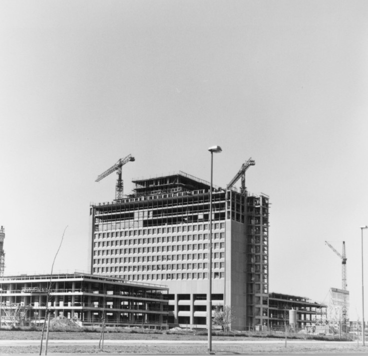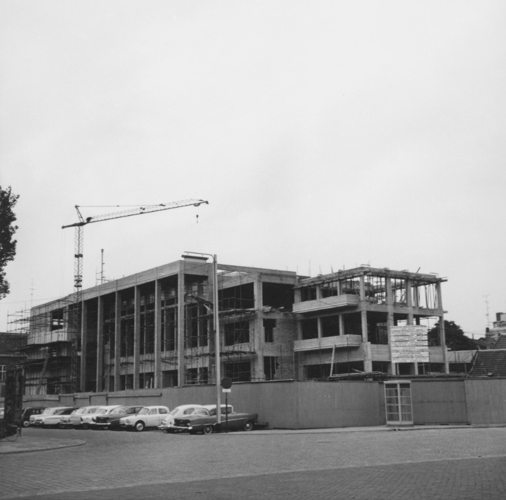 Het hoofdgebouw van de Technische Hogeschool in aanbouw. De foto moet uit begin jaren zestig zijn.