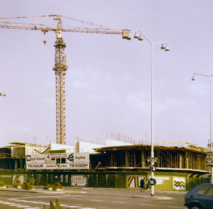 De bouw van de Hooghuis-flat met winkels en kantoren. Dit gebouw was het enige onderdeel uit het beruchte plan van Van den Broek & Bakema dat ooit is gerealiseerd.