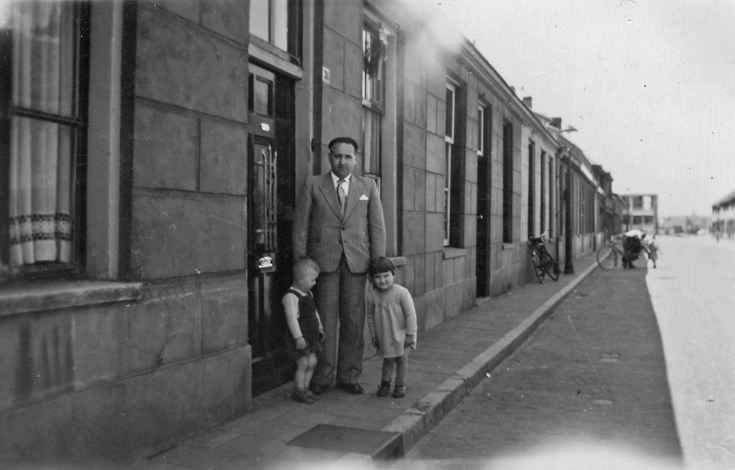 Piet Verstappen met kinderen Mieke en Adri staan hier voor Baarsstraat 36. Het pand werd afgebroken ten behoeve van een toegang tot Boekbinderij De Wit. Datum: 26-06-1955