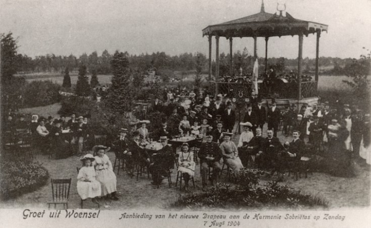 Harmonie Sobrietas, foto gemaakt bij de eigen muziekkiosk, schuin tegenover de Sint-Petruskerk, in de tuin van het boerenbondgebouw, Fluwijnstraat. Deze kiosk zou aan de gemeente Woensel geschonken wo [meer]