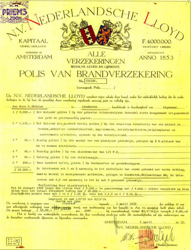 Opa Duthler had zijn zaak keurig verzekerd. Kijk waarvoor de verschillende goederen in het pand Willemstraat 24 en in het bijbehorende schuurtje werden verzekerd.
