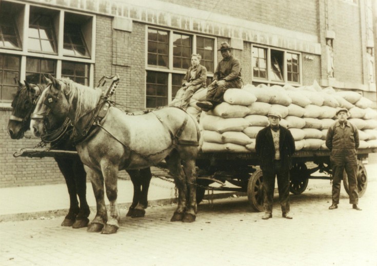 Kup' van Vroonhoven wist van aanpakken. Behalve verhuizingen werden transporten van allerlei aard aangepakt. Hier wordt een lading meel afgeleverd bij de in de Woenselse De Vriesstraat gevestigde [meer]