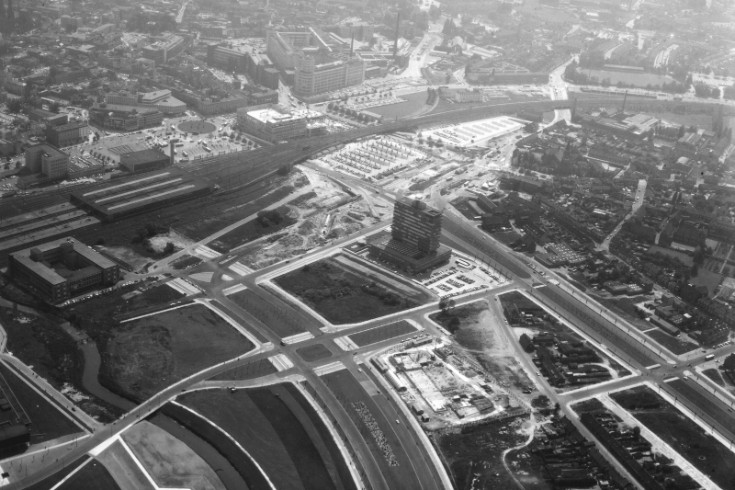 Met de Luciferfabriek, het Stroomhuis (toen nog echt transformatorstation), de Elisabethtunnel en het rangeerterrein van Philips. Opnamedatum 21-10-1967.