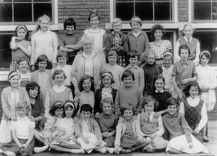 Nelleke van der Laak, Cisca Heesterbeek,Ankie ?,Peggy Spill, Zr. Aquina, Coby Vialle, Ineke Vissenberg, Carolien van der Wal, Juffr. Schellekens, 2 de rij Jaqueline van Hout, Ria van de Hurk, Nellie K [meer]