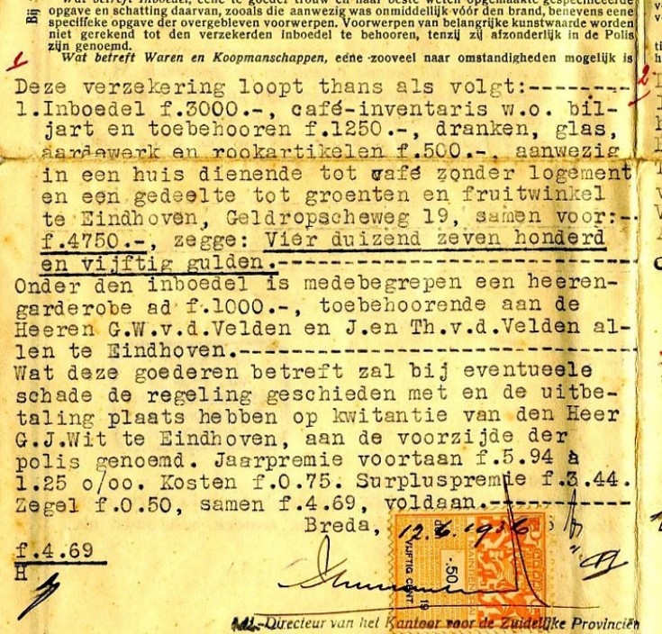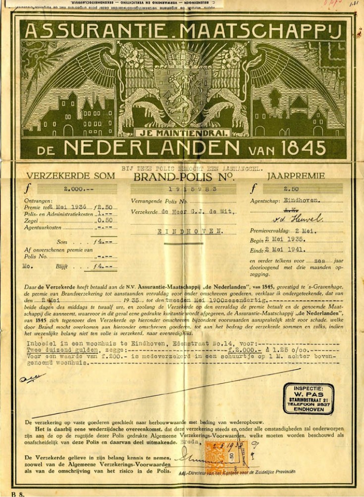 Blijkens deze verzekeringspolis verzekerde Gerrit de Wit zijn goederen. Allereerst (1935) in zijn pand in de Edenstraat, toen (1936) in cafe Methusalem aan de Geldropscheweg nr 19 en laatstelijk (in 1 [meer]
