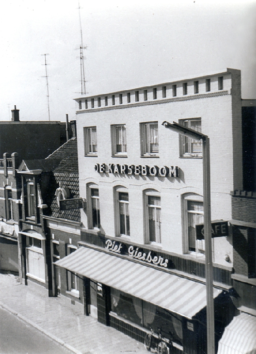 Café De Karseboom van Piet Giesbers. Helemaal links op nr 14 Rijwielhandel Toon Donders.