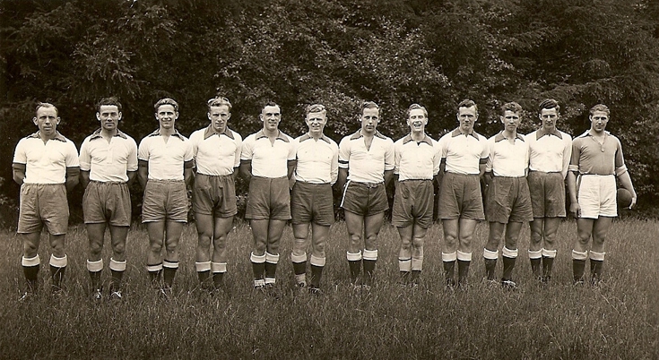 We speelden toen een wedstrijd tegen de kajotters in Limburg staande van l. naar r. Antoon v. Geffen, Jan Olfers, Piet Smids, Willy Smids, Jan Dirks, Tiny v. Germert, Trudo v. Gemert, Frans Smids zitt [meer]
