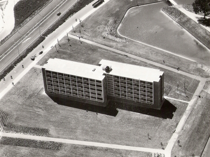 Nu eens een keer een luchtfoto van deze studentenflats aan de Boutenslaan. Alles ziet er spiksplinternieuw uit, de flat werd in 1959 geopend.