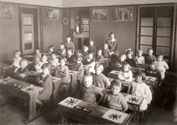 Kleuterschool op de Kloosterdreef. Meisje met donkere bril Doortje Scheepers. Zij is overleden. Achter bij de juffrouw Jan van Gennip, daarnaast zijn broer Piet, die sinds 1953 in Australië woont [meer]