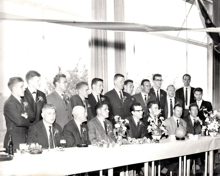 Receptie ter gelegenheid van het behaalde kampioenschap door het 1e team van handbalvereniging Stratum Meteoor. Staande v.l.n.r.: Tonnie Dursten, Herman van de Ven, Piet Kuiper, Jan Horsten, Frans Lu [meer]