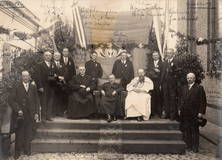 Hier een foto van Pastoor Gos. van Heeswijk die zijn Zilveren priesterfeest viert. Hij was de bouwpastoor van de H. Hart van Jezus aan de Ploegstraat. Hier zit hij samen met meneer de Deken en zijn ke [meer]