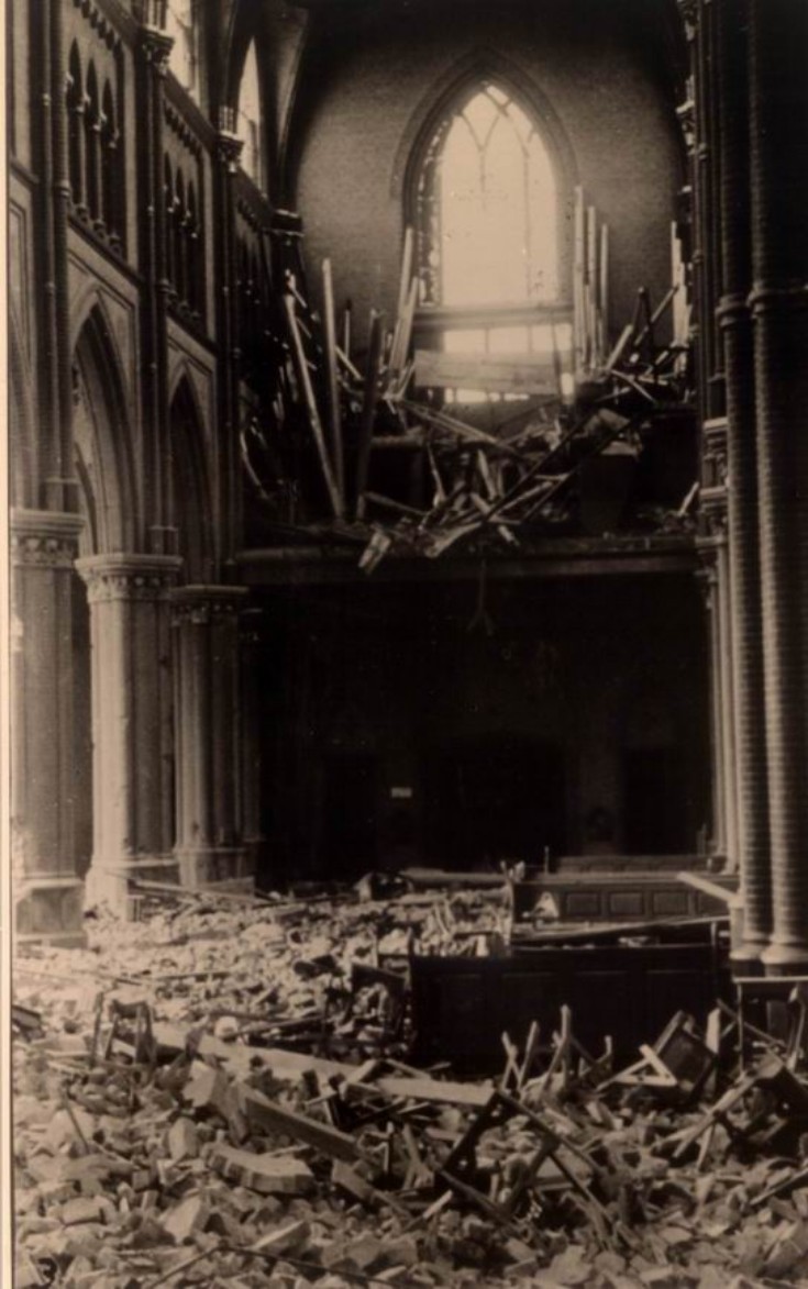 Na de brand in 1936, nu bommen op de kerk in september 1944.
