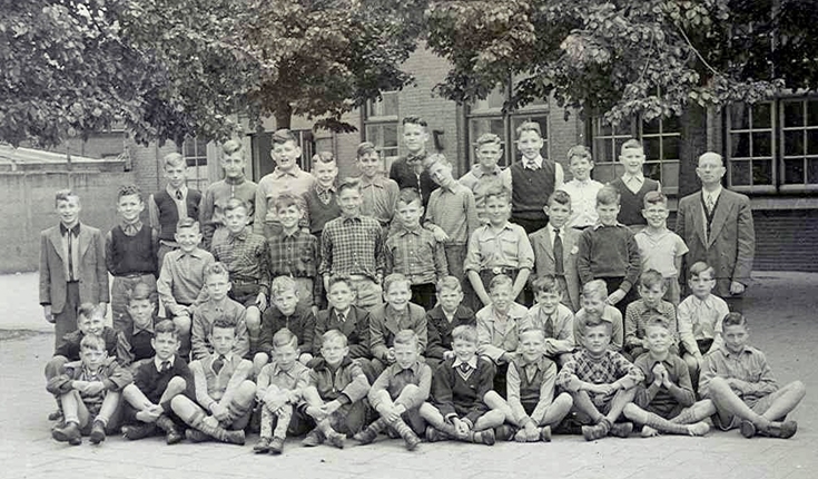 Klas 4 van schooljaar 1949-1950. Klik op de knop voor de grote versie om de nummers te zien.