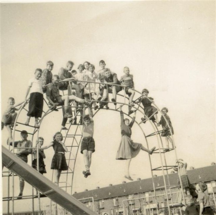 Groepsfoto, gemaakt door mijn vader, van de jeugd op het klimrek in de speeltuin aan het Hugo de Grootplein rond 1960.