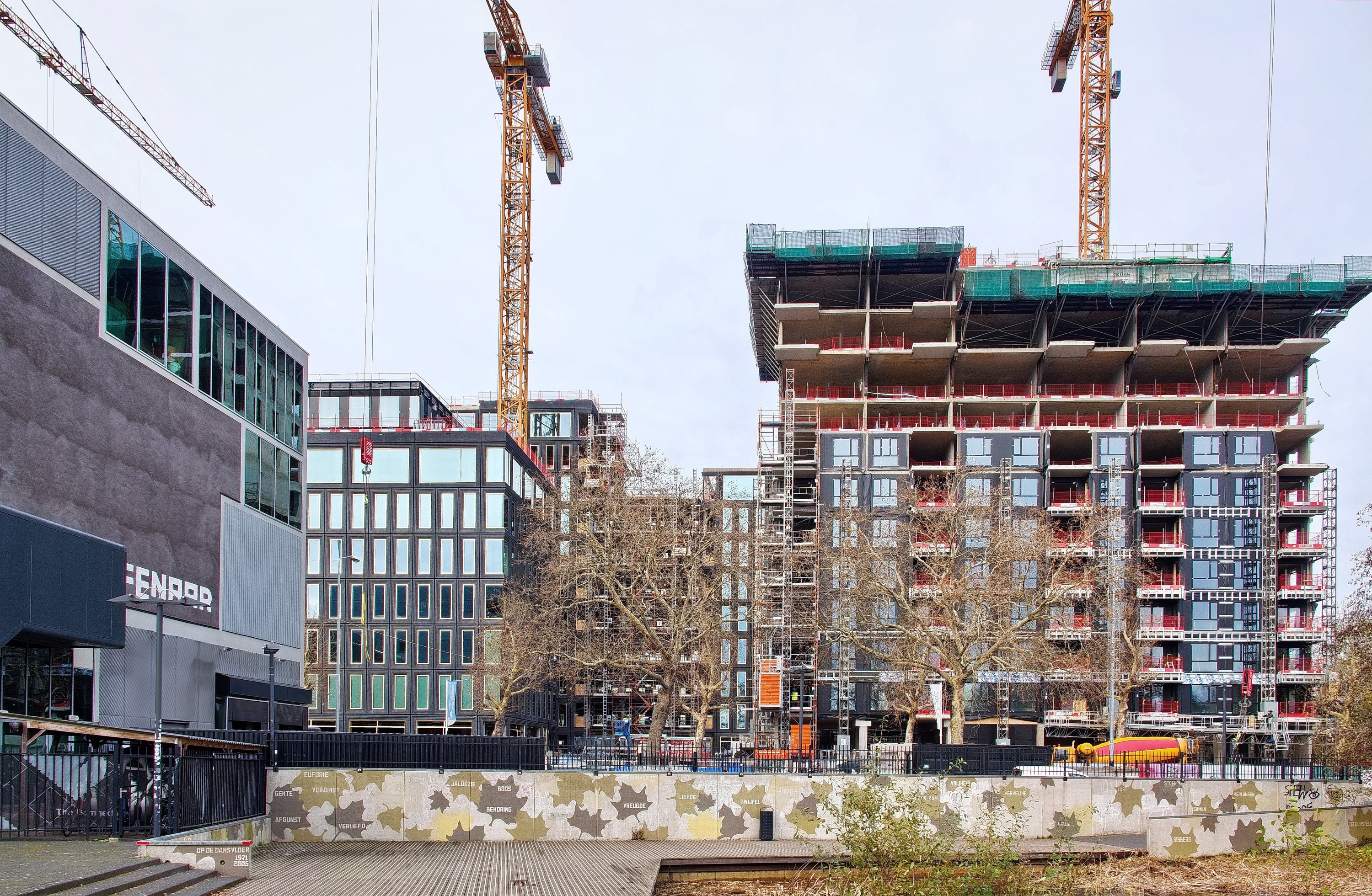 Zicht op het bouwen van projecten Edge en Lightyards, gezien vanaf de binnenplaats met waterpartij naast de Effenaar. Deze hoogbouw komt tussen de Stationsweg en het spooremplacement, tussen de Social [meer]