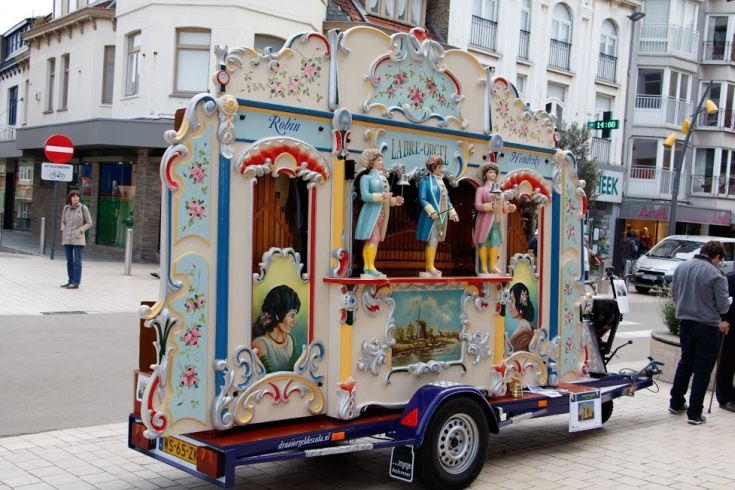 Het kleurige draaiorgel Fata Morgana in oktober 2018 op de hoek van de Markt en de Hermanus Boexstraat. Op de achtergrond de bekende juwelier Siebel, chocolaterie Boulanger en de bekende brillenwinkel [meer]