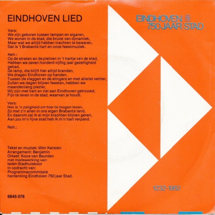 Singletje uitgegeven naar aanleiding van Eindhoven 750 jaar stad. Tekst en muziek van Wim Kersten. Op de keerzijde horen we het lied "We magge d'r zijn" van de Federatie van Eindhovense Carnavalsv [meer]