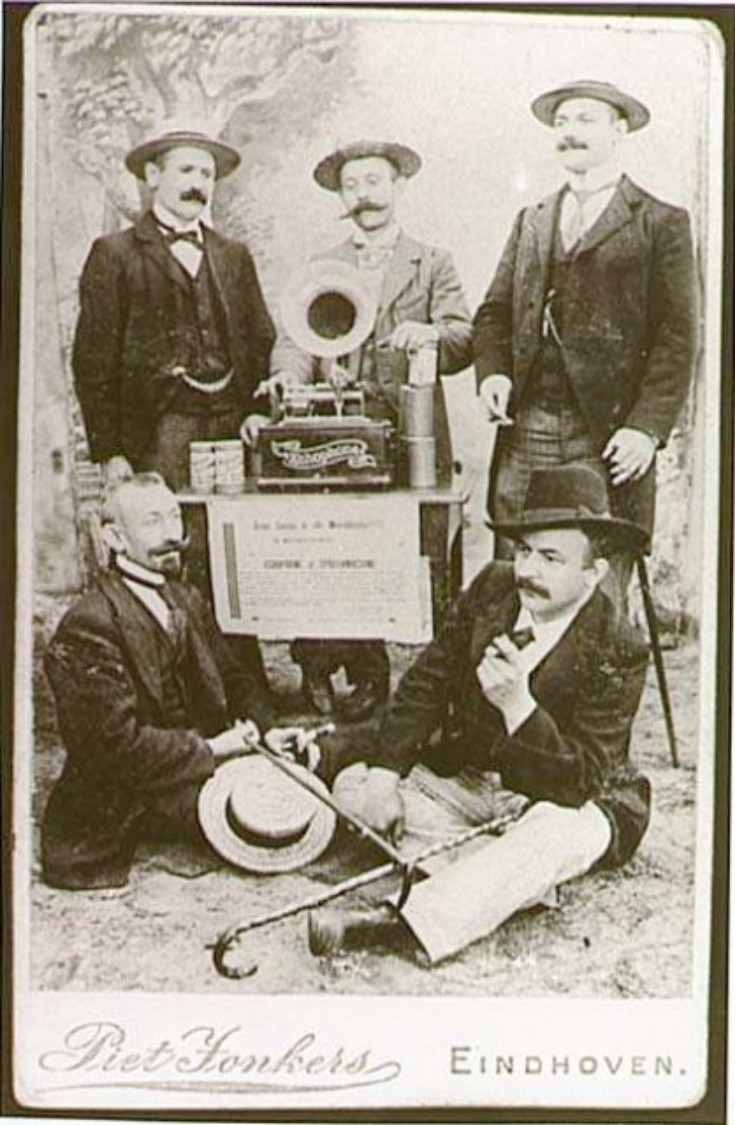 Een groepje mannen, met links zittend de fotograaf Jan Bijnen, met een 'echophone'. De tekst op het bord luidt: "Groot succes in alle werelddeelen !!!! H.H. Muziekliefhebbers. Het is bewezen d [meer]