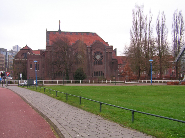 De kapel van het voormalige Augustinianum aan de Kanaalstraat. Achter de kapel zien we een deel van het voormalige klooster. Ervoor loopt de Nachtegaallaan. Het gazon ligt voor het Havenhoofd en het g [meer]